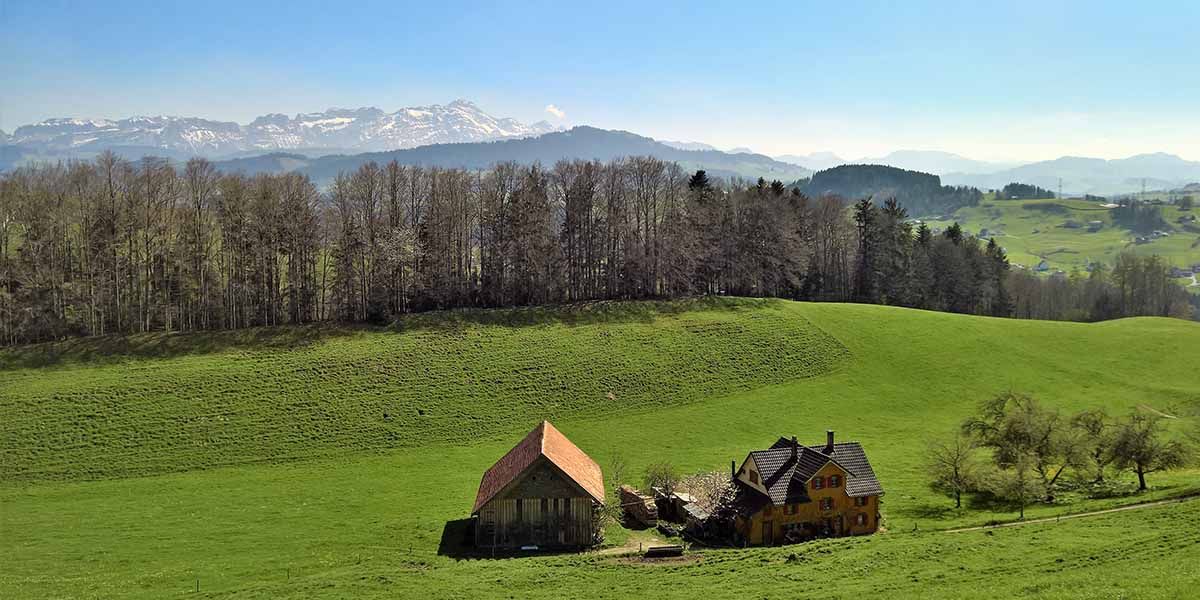 From the largest city in eastern Switzerland, it is only a short walk into the green. Start at the railway station in Schwarzer Bären, cross the main road and after a few hundred steps on gravel road, you are already in another world. It is particularly beautiful here in spring. There are countless blossoming fruit trees in flower-filled meadows, while in the distance there is still a lot of snow on the Alpstein slopes.