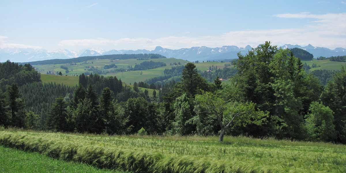 In a slight ascent, continue past the crossroads to Lisiberg. Despite the name, this is not a real mountain, but the view you can enjoy from here is as good as a high alpine panorama: the fields and forests stretch towards Lake Thun, with the chain of the Bernese high Alps looming over it.